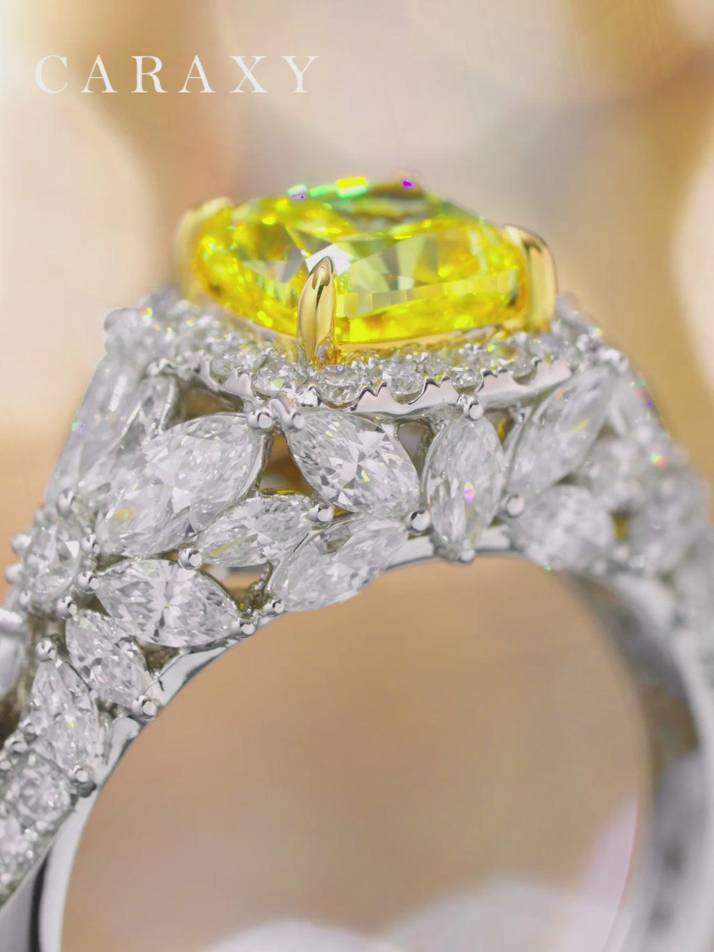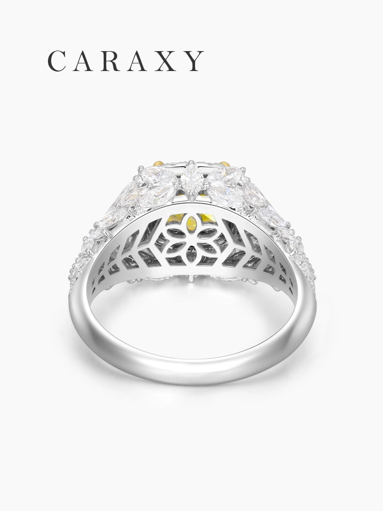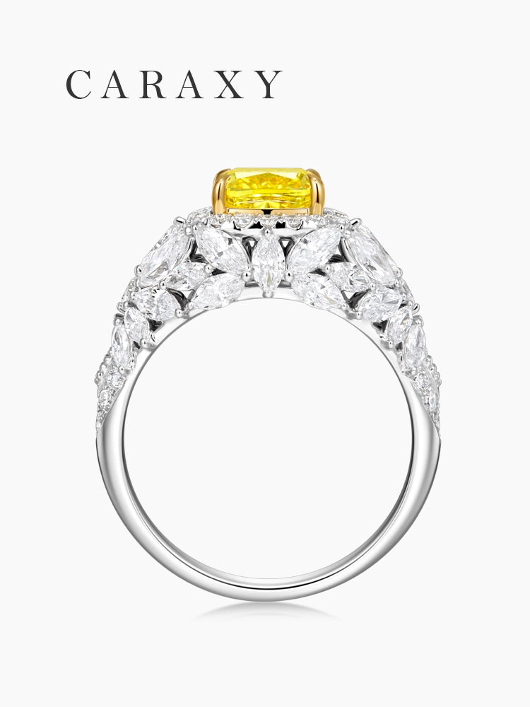 Designed with a sophisticated halo and cluster setting, this yellow diamond masterpiece is handcrafted in premium 18K gold to provide a warm and luxurious foundation. The most remarkable feature of this cushion cut engagement ring is its artistic band, which is meticulously pave with marquise-cut diamond accents arranged in a blooming floral pattern. This high-jewelry design is the perfect choice for those seeking a unique symbol of love that combines ethical lab-grown stones with avant-garde craftsmanship.