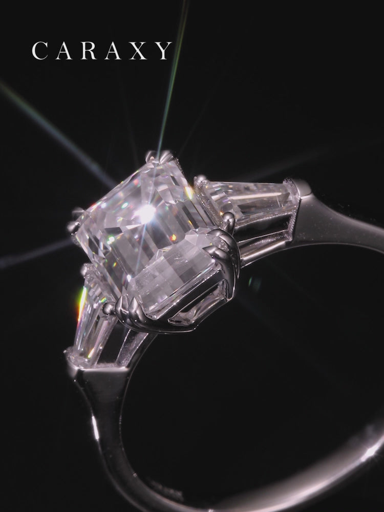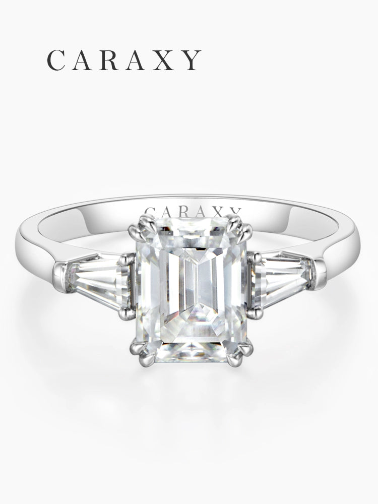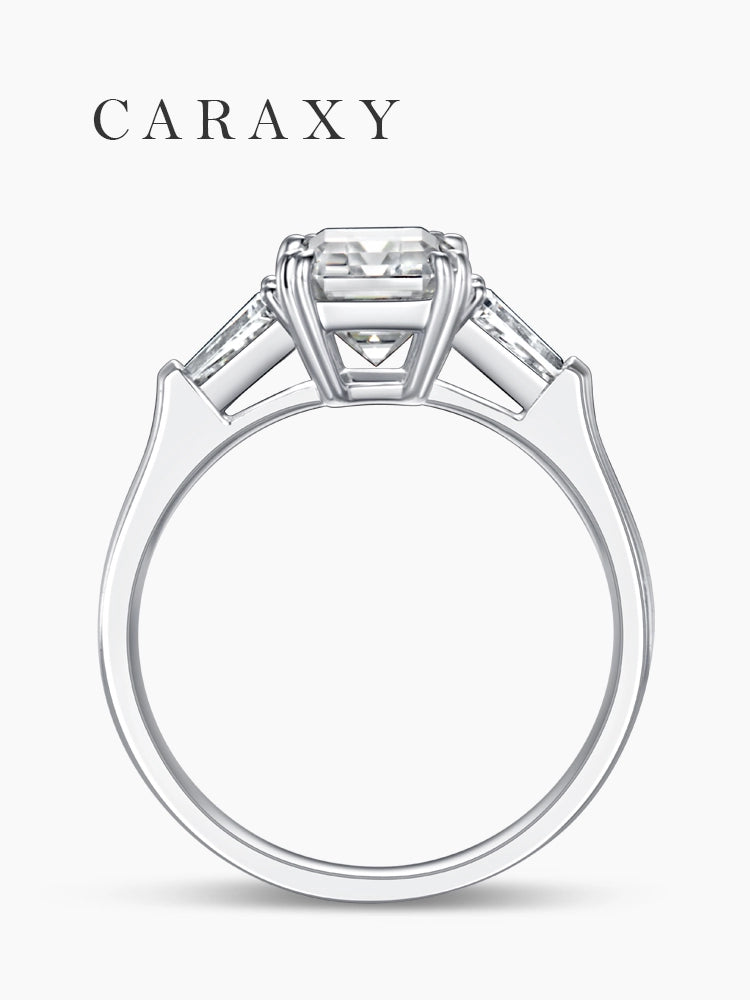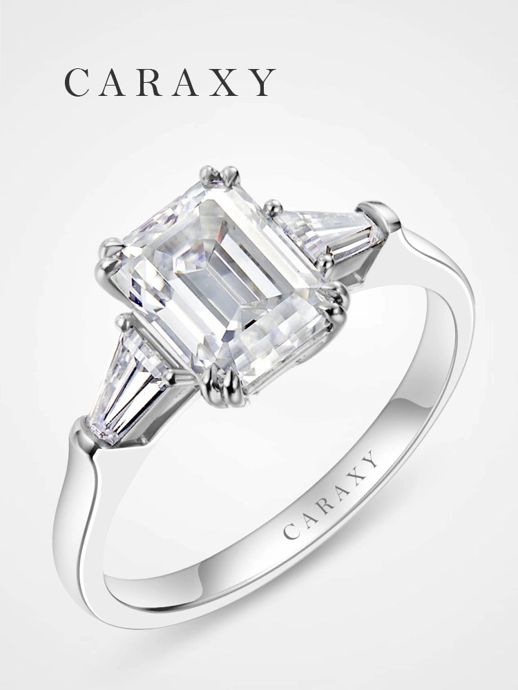 The emerald-cut center diamond radiates a hall-of-mirrors brilliance, framed by two elegant tapered baguette side stones that enhance its sleek geometry and elongate the finger.