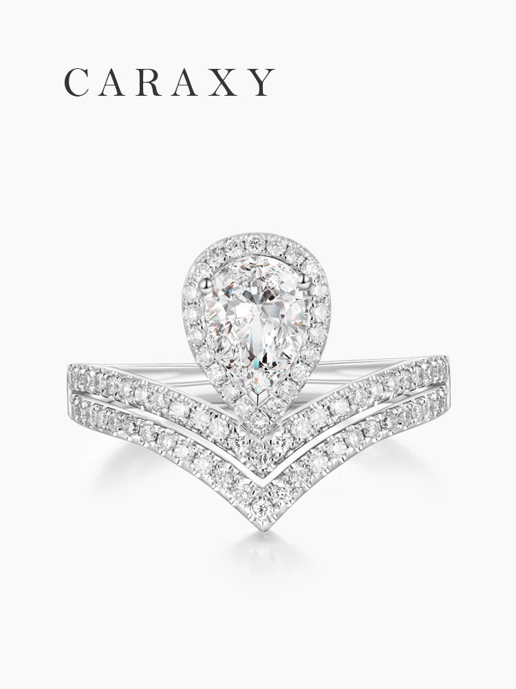 Paired with a matching V-shaped band, the set creates a harmonious layered sparkle — symbolizing two hearts becoming one.