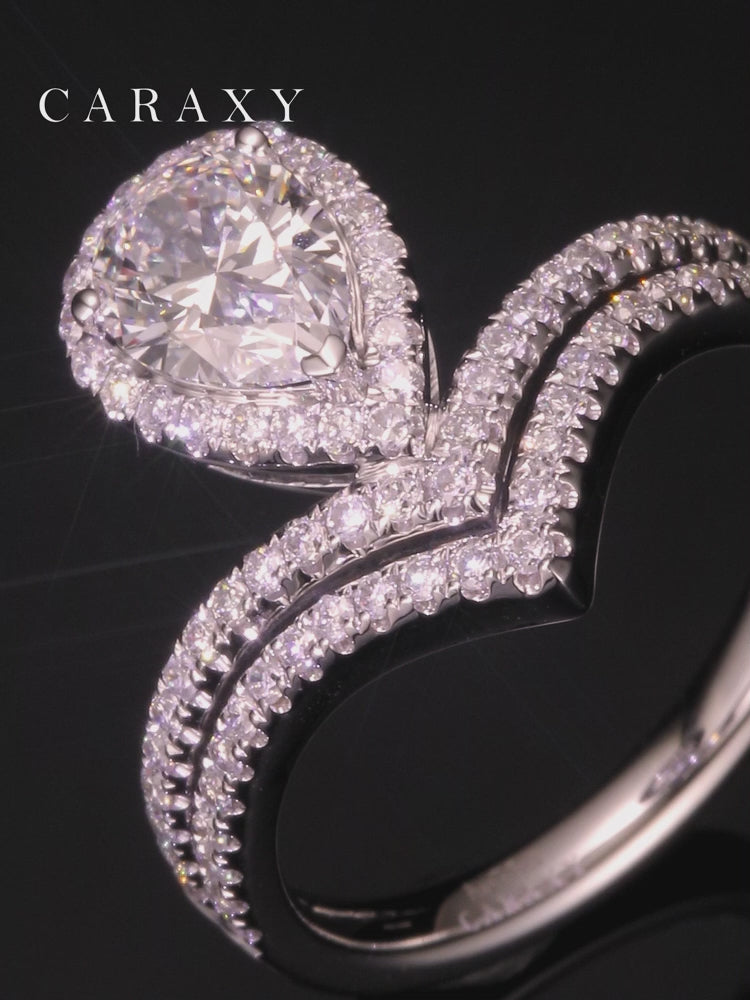 The main ring features a captivating pear-shaped lab grown diamond, surrounded by a radiant halo of pavé diamonds.