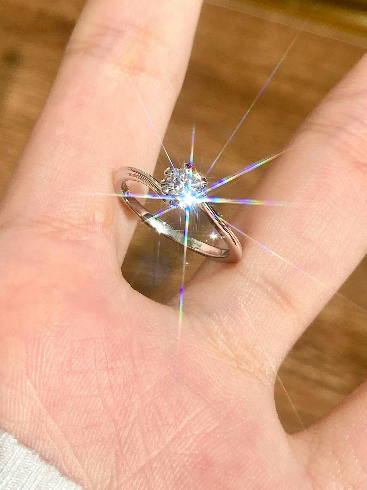 The 45-degree twisted dual-arc design enhances the diamond’s brilliance and three-dimensional presence, while six graceful prongs arranged in subtle heart shapes securely cradle the round brilliant-cut center stone — amplifying its fire and adding a romantic allure.