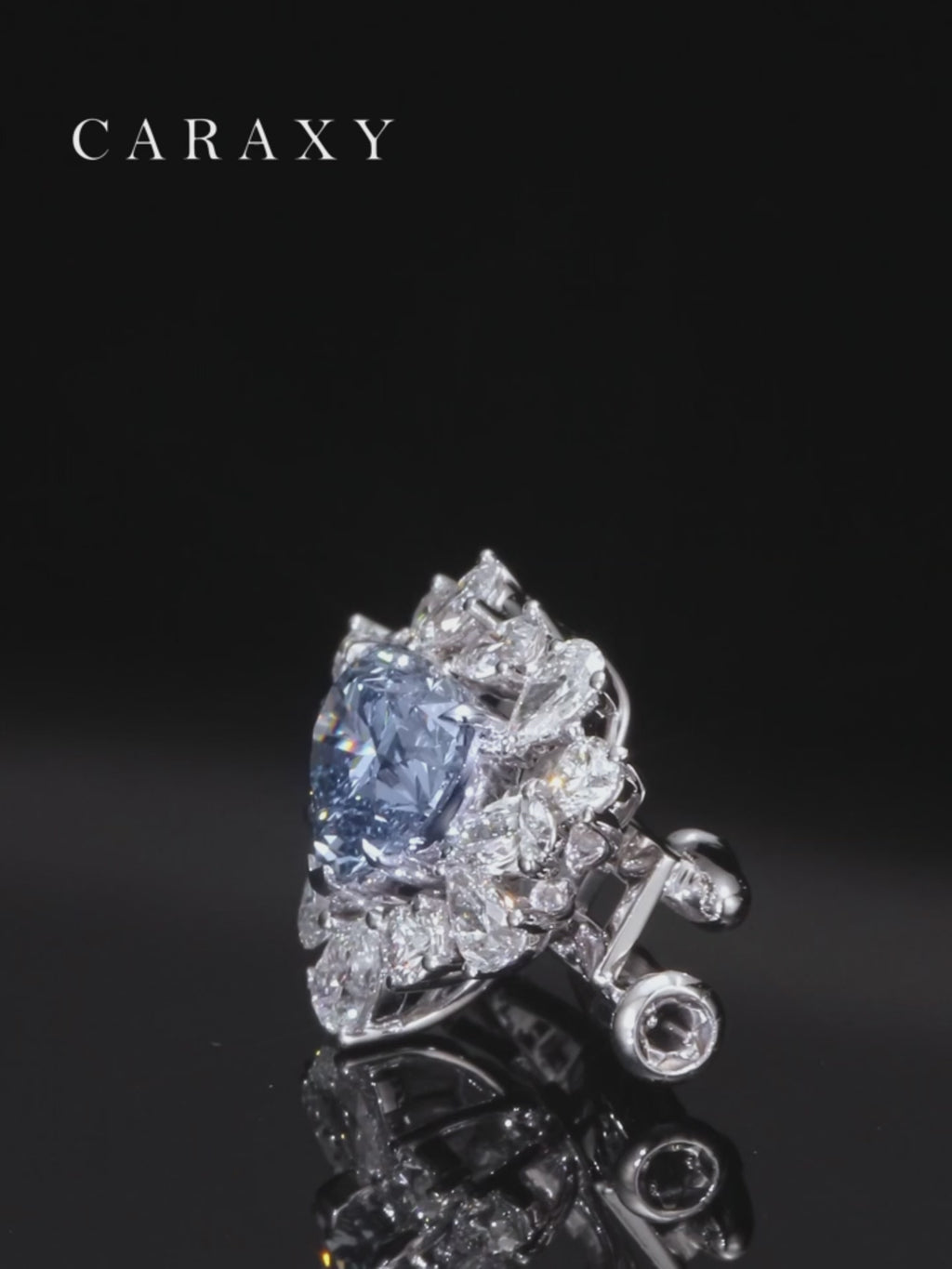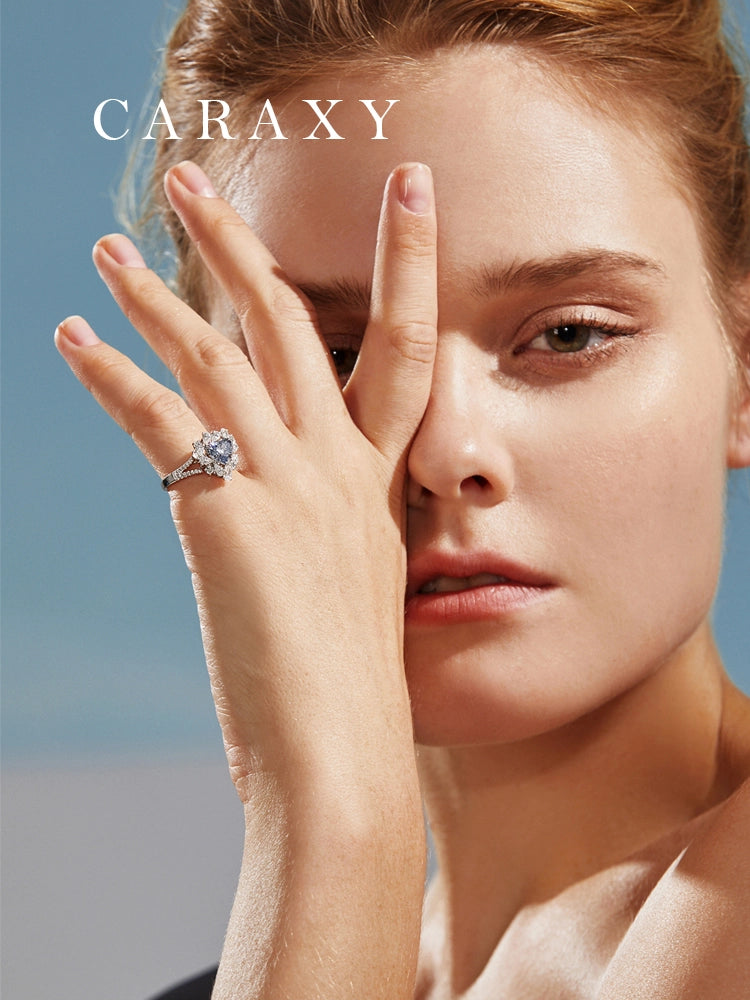 The central blue diamond is meticulously cradled within a breathtaking halo diamond engagement ring setting, where a cluster of pear and round-cut lab diamonds creates a floral-inspired radiance. The delicate diamond heart design symbolizes deep affection, while the split-shank pavé band adds a touch of modern sophistication to its timeless appeal. Whether as a proposal piece or a high-end fashion statement, this ring offers an ethical and luxurious alternative for the contemporary bride.