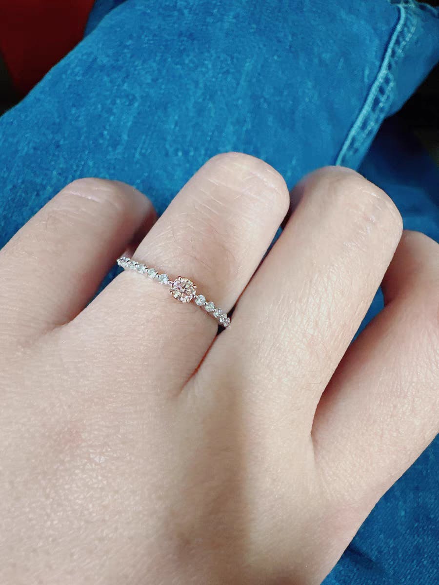The half pavé band, set with brilliant white lab diamonds, adds an extra layer of sparkle while maintaining a refined, lightweight silhouette. The contrast between rose and white gold enhances the soft hue of the pink diamond, creating a sophisticated and feminine look perfect for everyday wear or special moments.