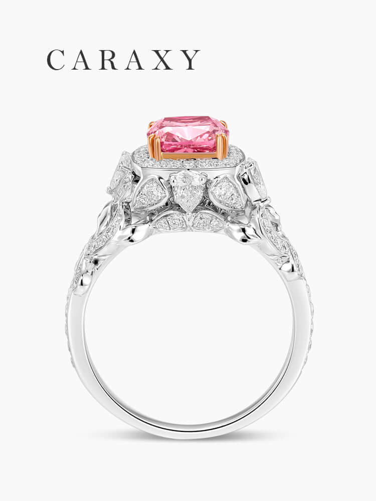 Experience timeless romance with this vintage-inspired pink lab grown diamond ring, featuring a captivating cushion-cut center stone framed by a shimmering halo of pavé diamonds.